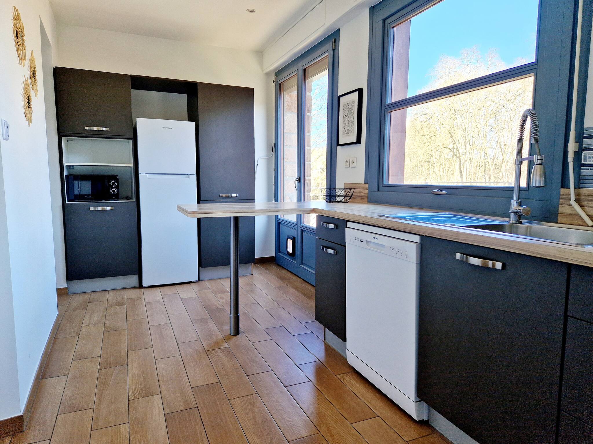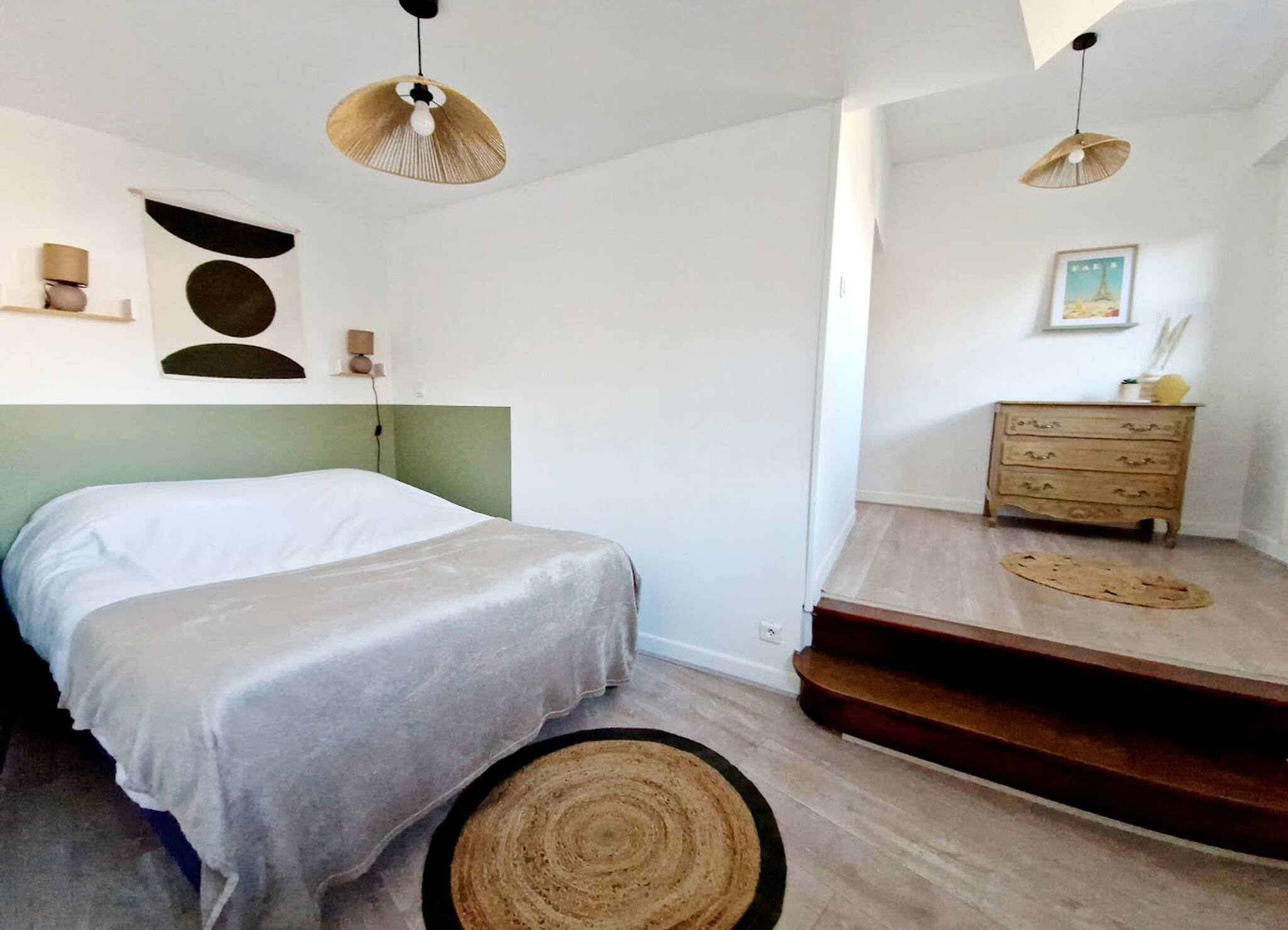 Au premier étage, découvrez une salle à manger, une cuisine entièrement équipée, un balcon, une chambre double avec un lit queen-size (160x200), une salle de bain, un dressing, une buanderie et des toilettes séparées.