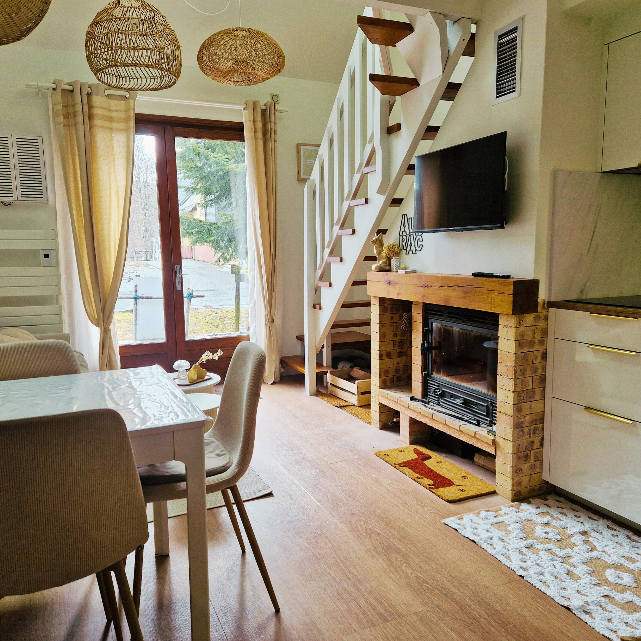 Au rez-de-chaussée, vous trouverez un salon confortable avec télévision, une salle à manger conviviale et une cuisine américaine moderne entièrement équipée (plaque à induction, four, micro-ondes, lave-vaisselle, réfrigérateur, congélateur, cafetière, bouilloire, grille-pain et tout le nécessaire de cuisine). Une chambre avec lit double, une salle d’eau et des WC séparés complètent ce niveau. La terrasse de 8 m² avec mobilier de jardin permet de profiter de l’air pur de l’Aubrac.