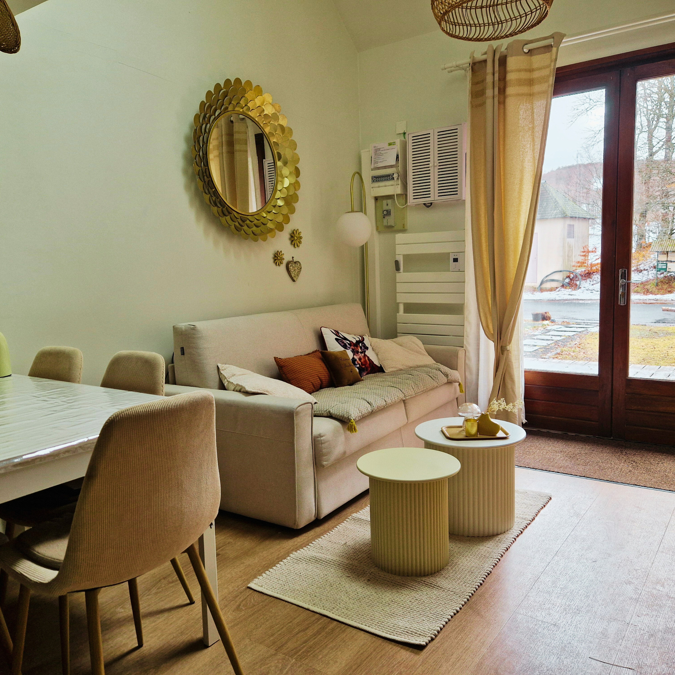 Le chalet est mitoyen sur un seul côté, mais il offre un réel sentiment d’intimité grâce à l’absence totale de vis-à-vis. On profite ainsi pleinement du calme et de la nature environnante.