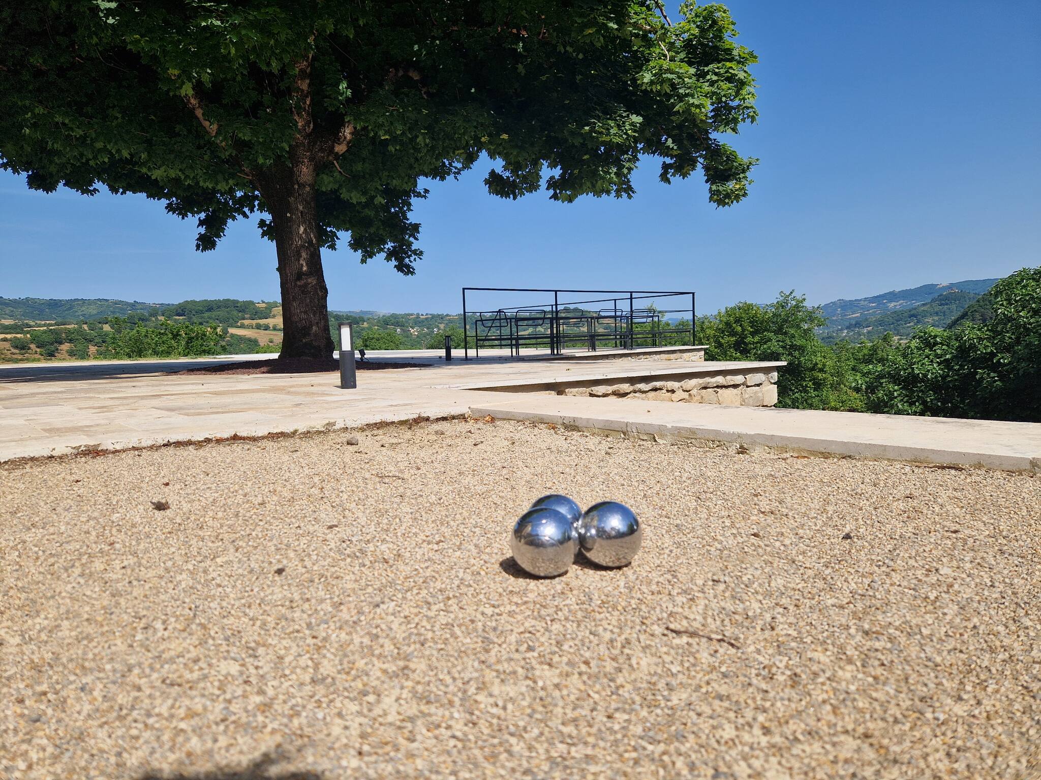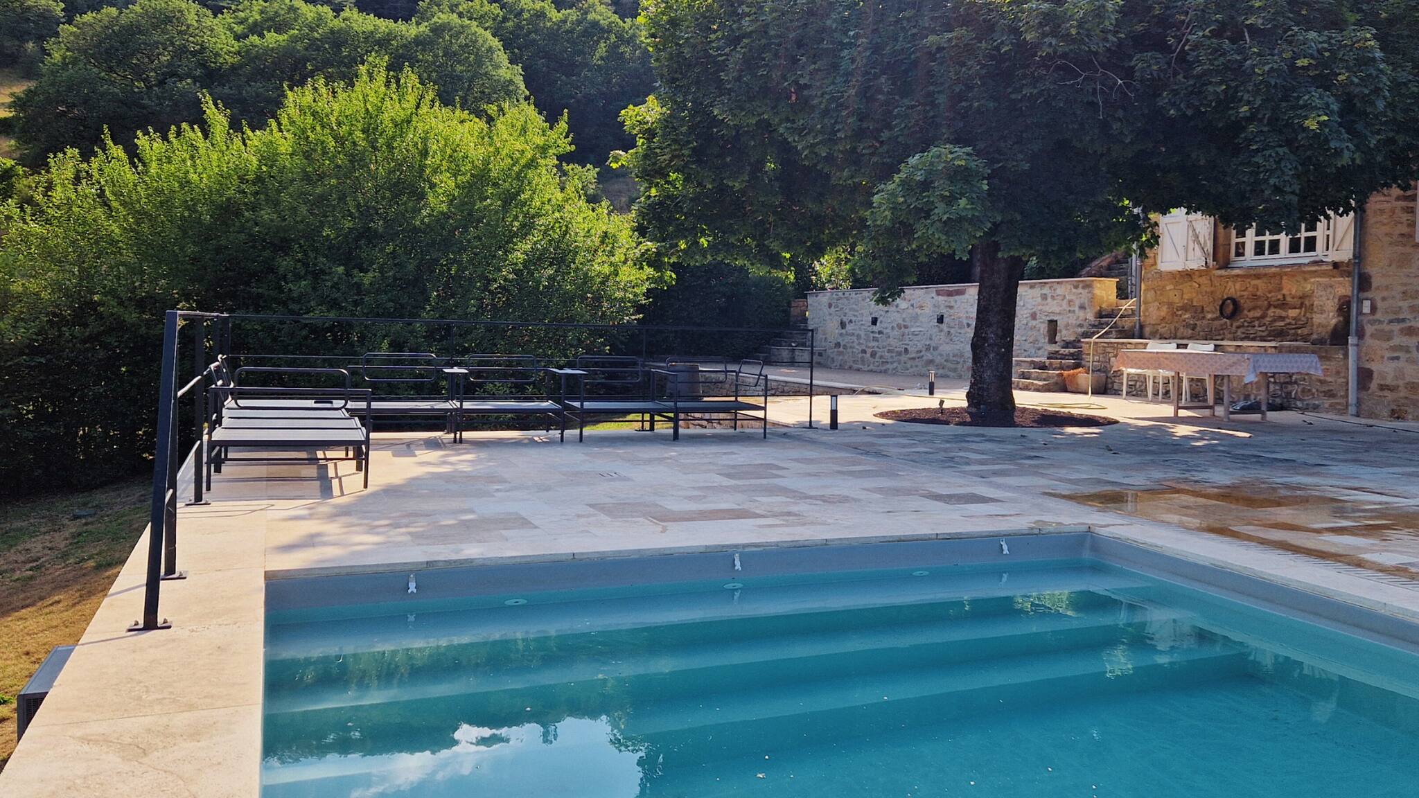 À Bessuéjouls, dans un cadre calme et verdoyant, grande maison familiale avec piscine (du 10/07 au 30/09) et terrain de pétanque.