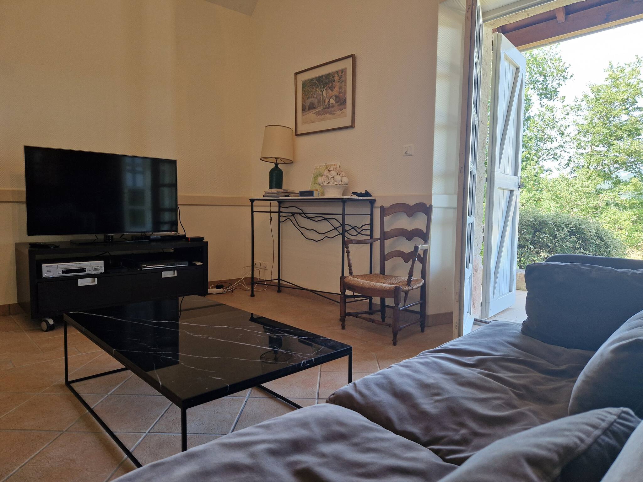 Niveau -1 : second salon avec TV, cuisine toute équipée ouverte sur la terrasse menant à la terrasse