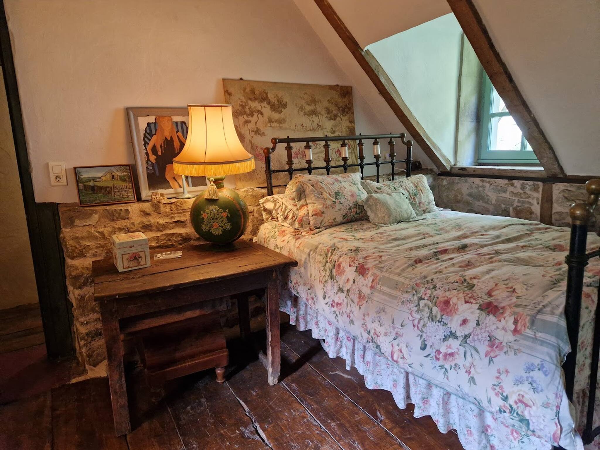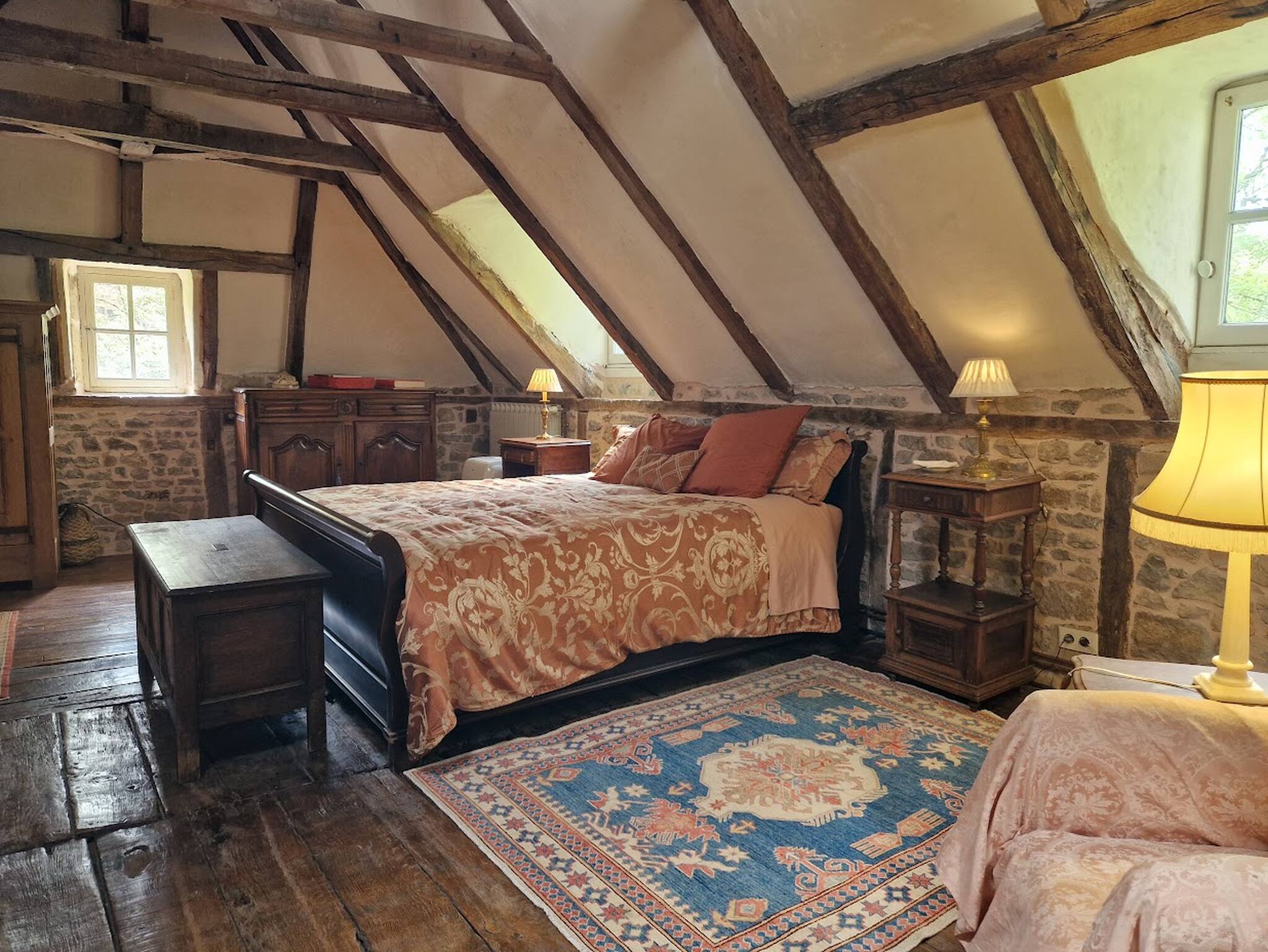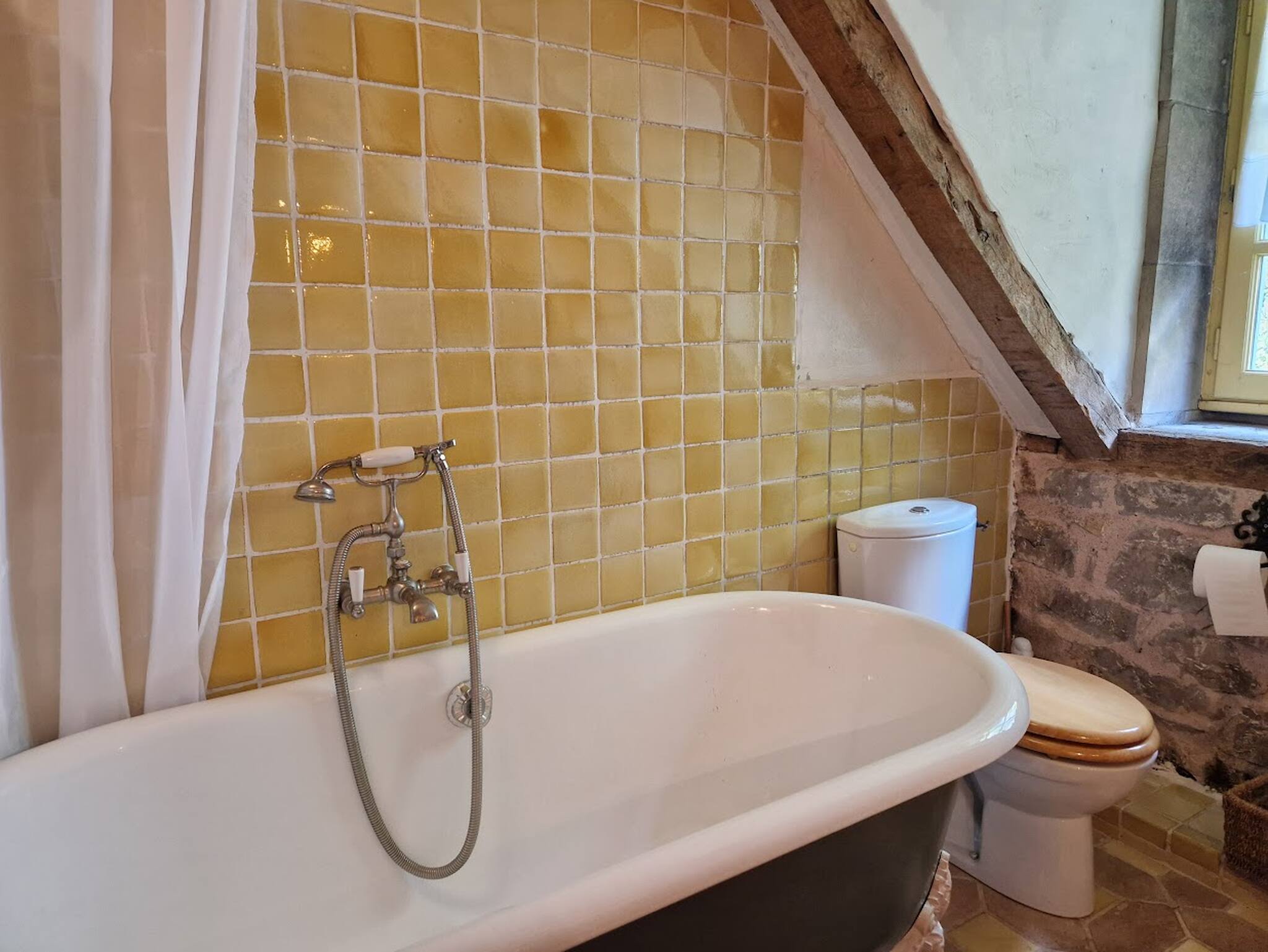 Au premier niveau, vous trouverez une chambre pour 2 personnes (lit double) décorée chaleureusement dans le respect du lieu. Ainsi qu’une salle de bain comprenant une baignoire, une douche et un WC, accessible par un escalier au -1.