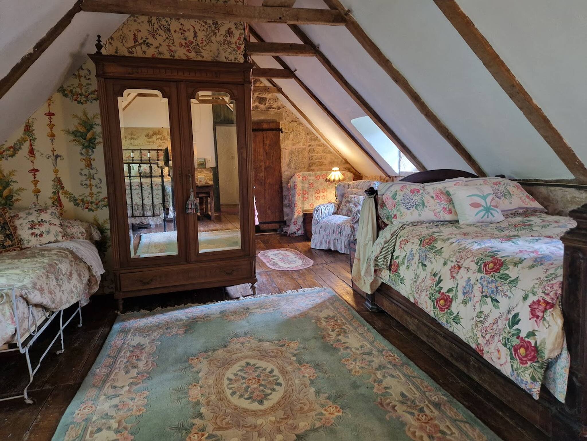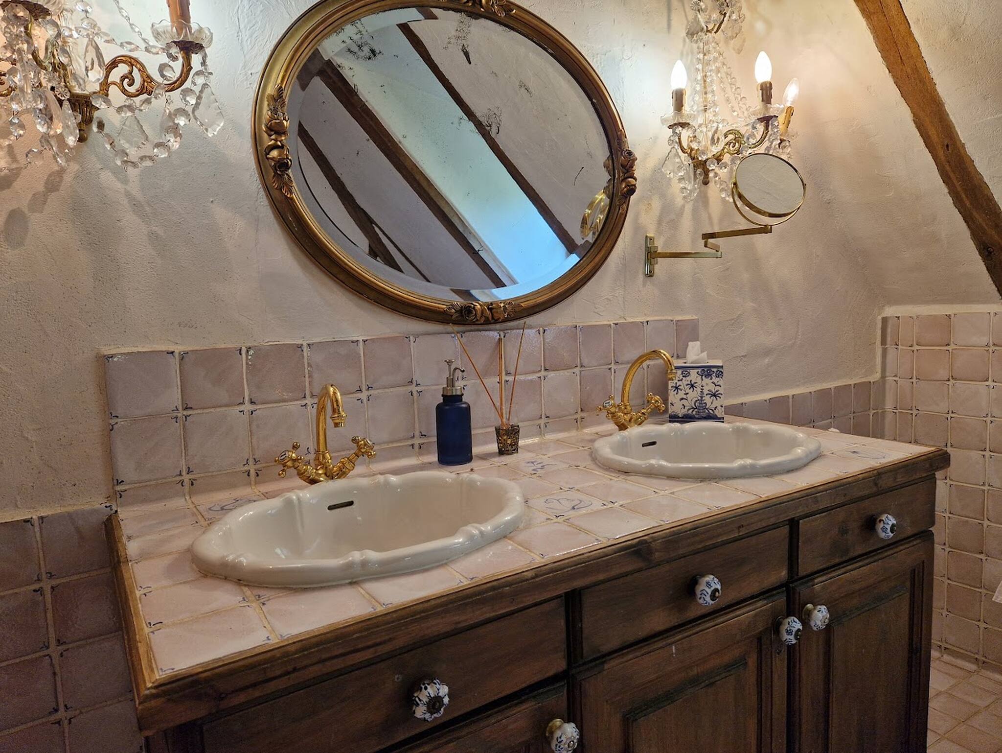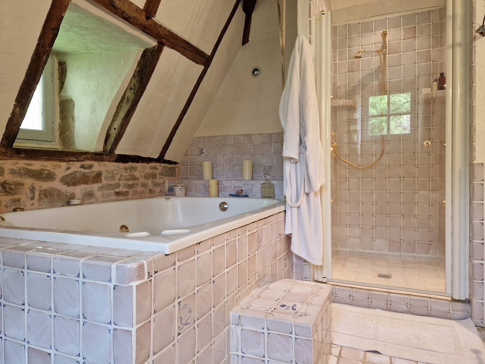 A l’étage, il y a une suite parentale pour 2 personnes (lit double) avec sa salle de bain équipée d’une douche, une baignoire balnéo et un WC. Sur le même étage, vous découvrirez deux chambres en enfilade avec leur salle de bain commune au milieu (douche et WC). La première chambre peut accueillir jusqu’à 3 personnes avec des lits simples et la seconde est une chambre pour deux personnes avec un lit double.