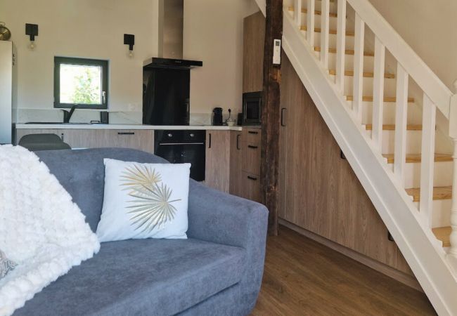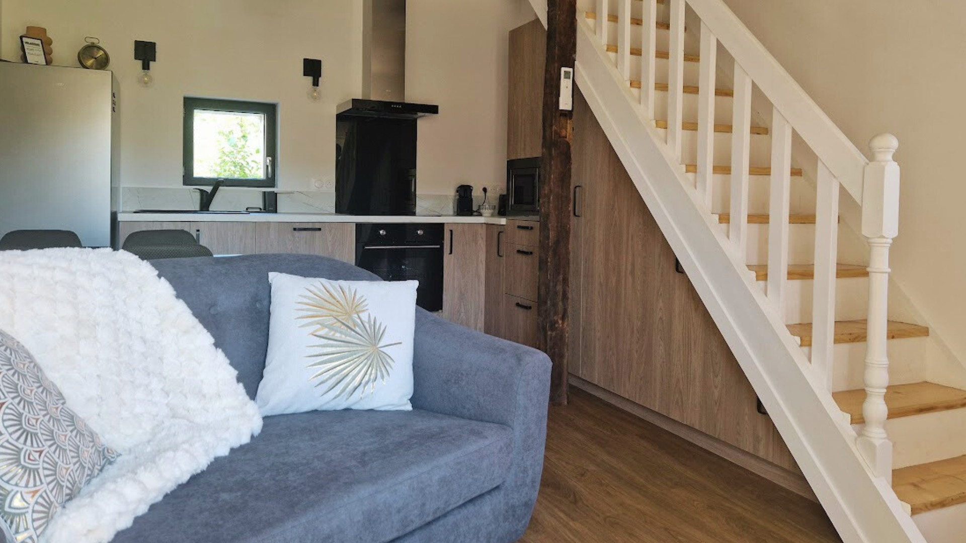 Rez-de-chaussée : une cuisine ouverte toute équipée (lave-vaisselle, four, micro-ondes, frigo, cafetière, machine à laver…) donnant sur un salon cosy avec TV connectée.