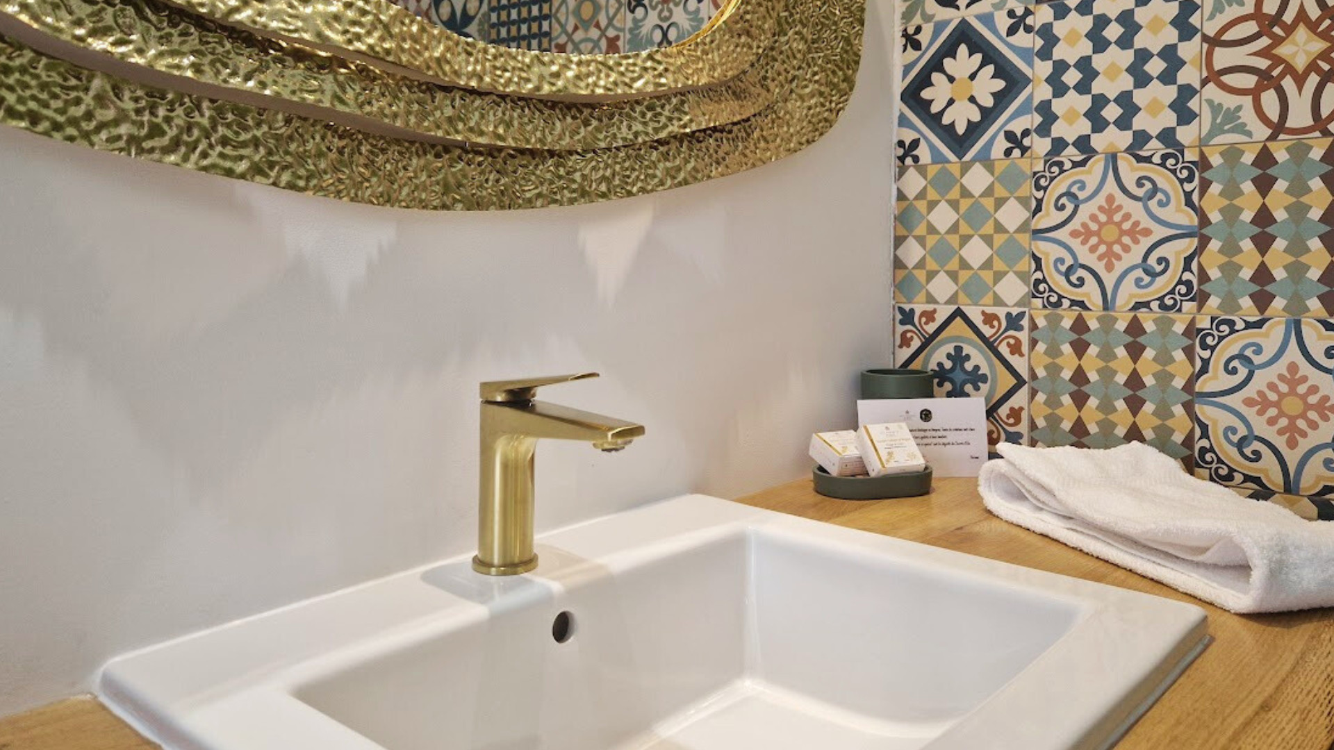 À l’étage : une chambre avec literie neuve et salle de bain ouverte, WC séparés et une deuxième TV connectée pour plus de confort.