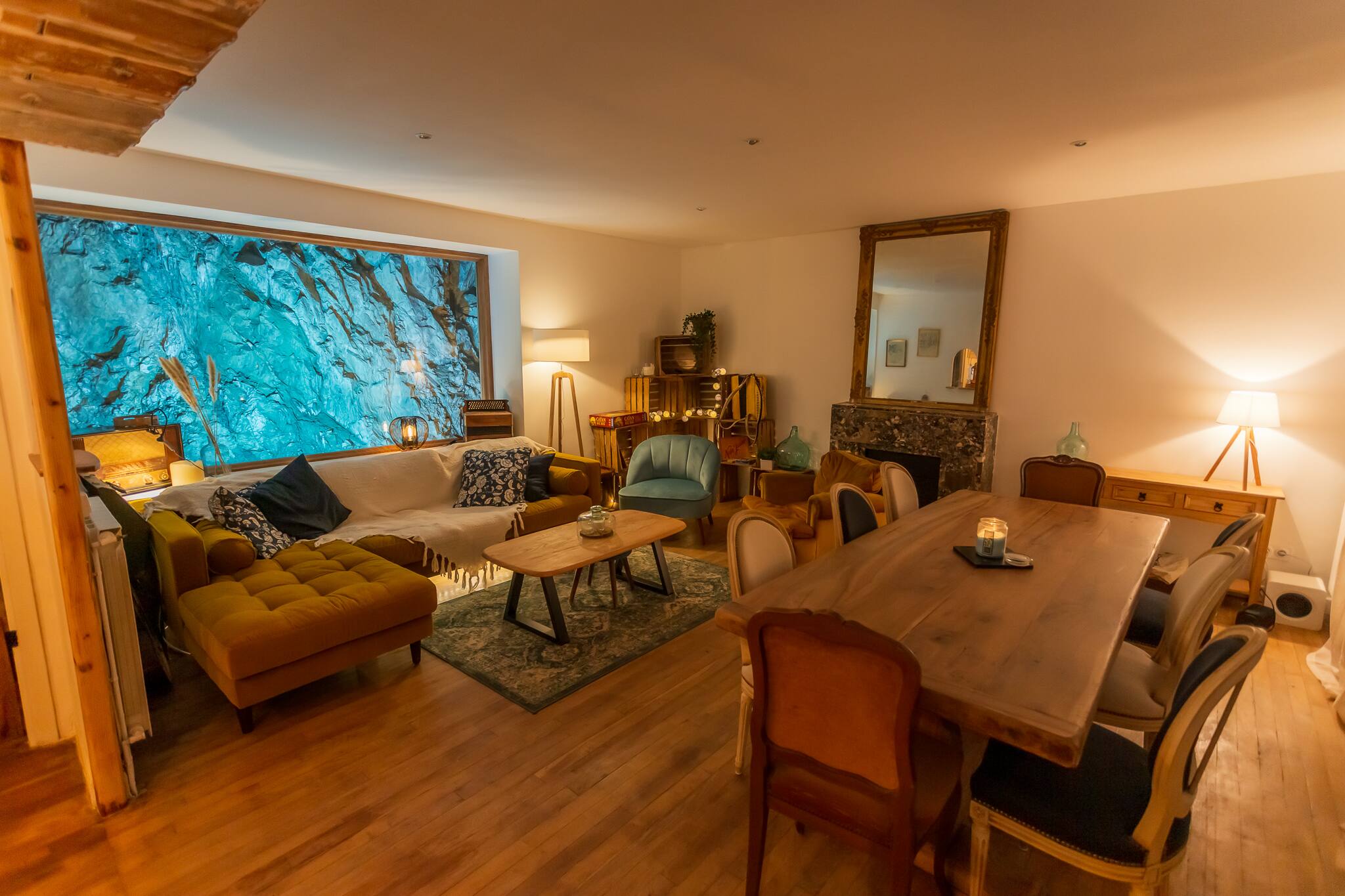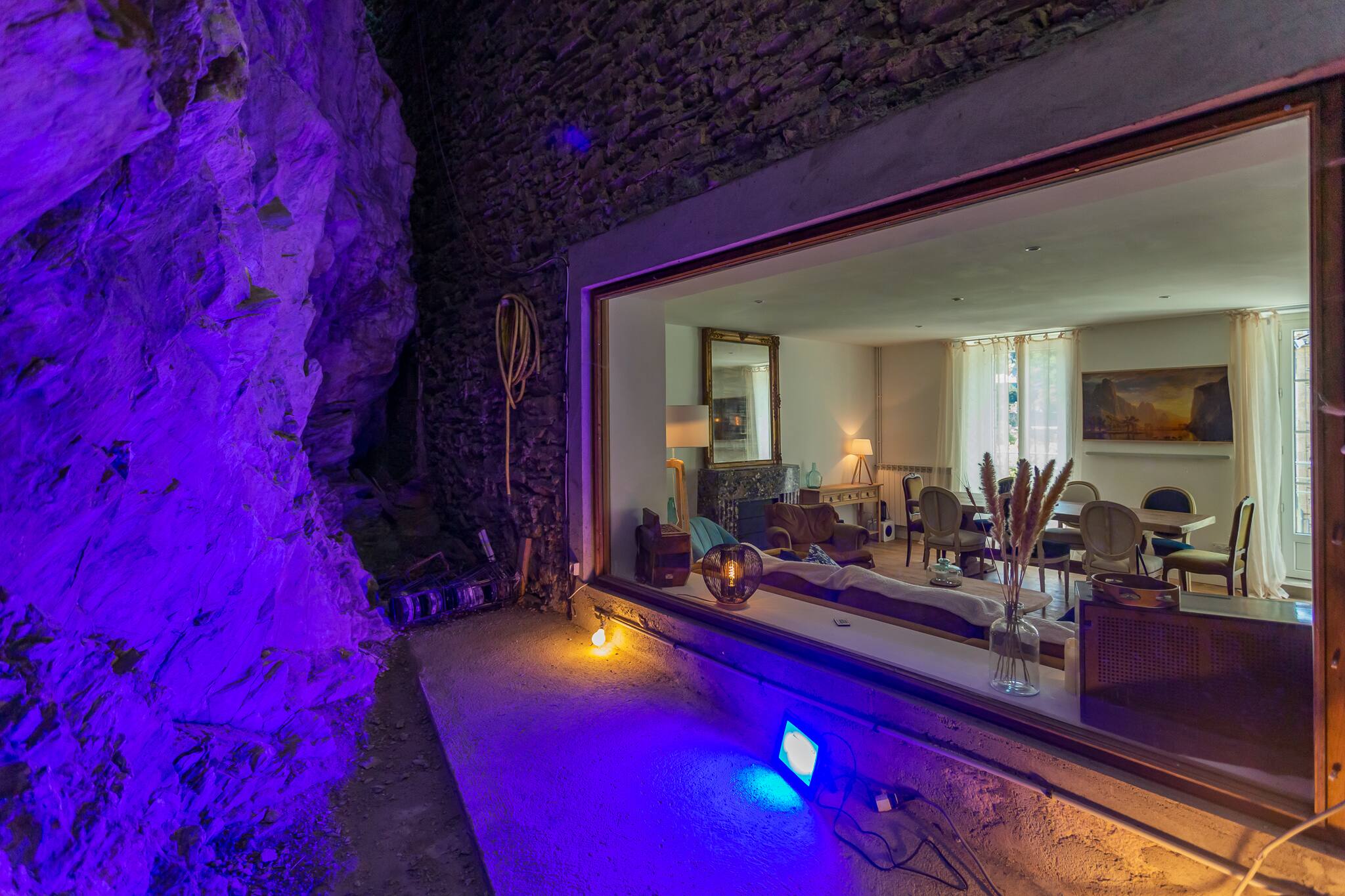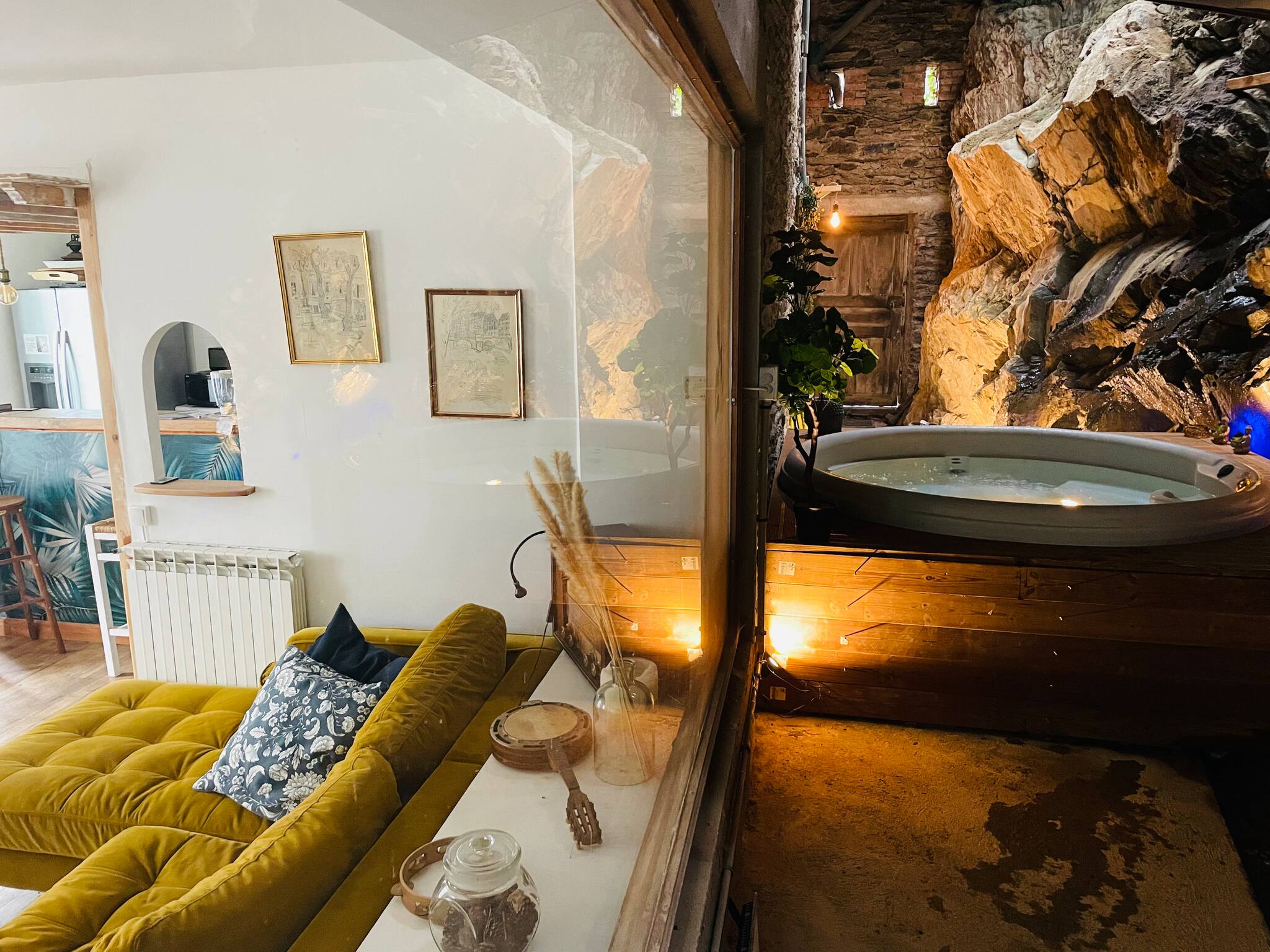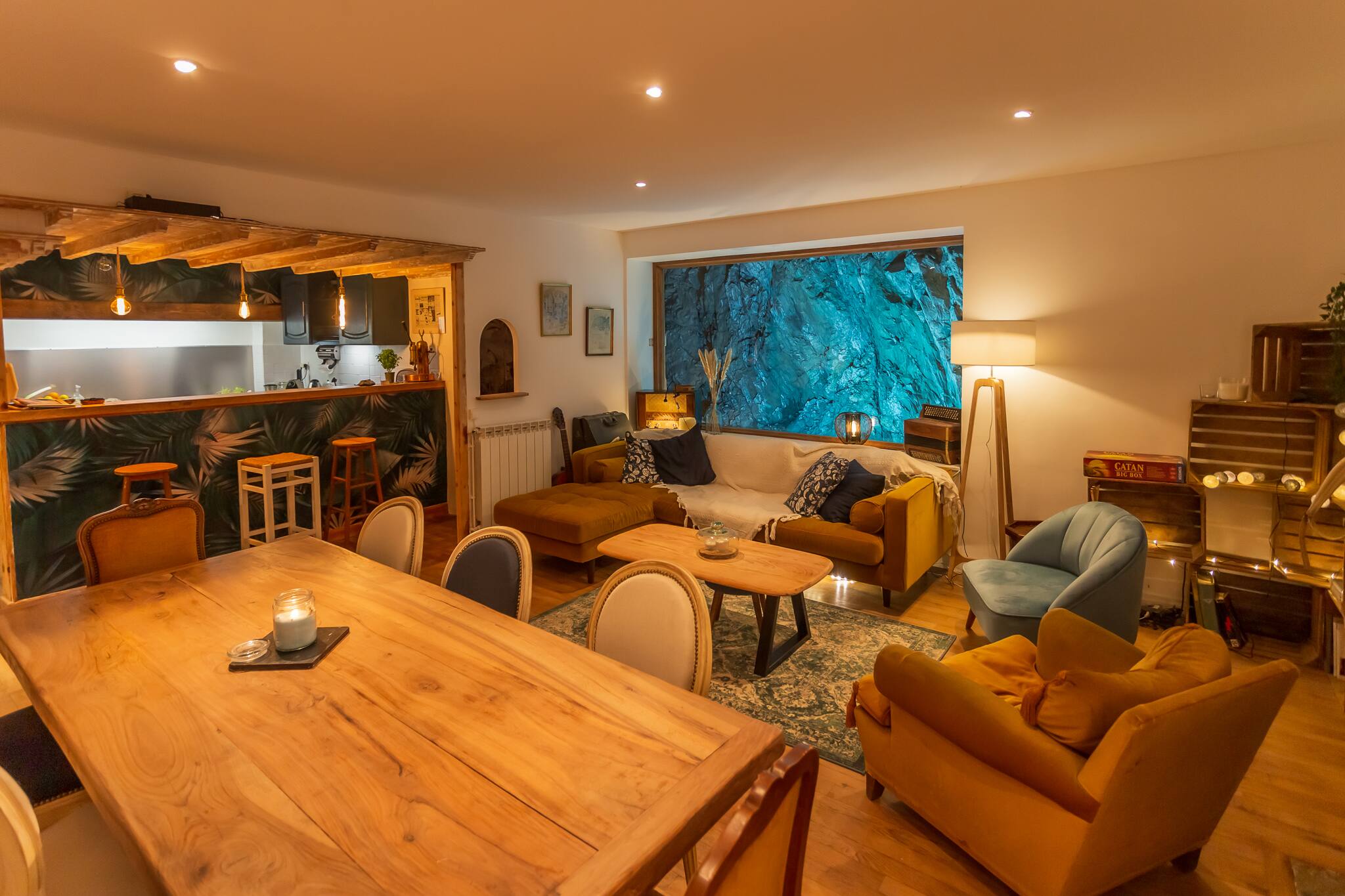 1er étage: séjour avec cuisine ouverte/salon (Tv connectée, wifi, enceinte Bluetooth, jeux de sociétés) avec magnifique vue sur la roche. / buanderie (hammam) / 1WC / accès grotte et jacuzzi / jardinet avec bains de soleil