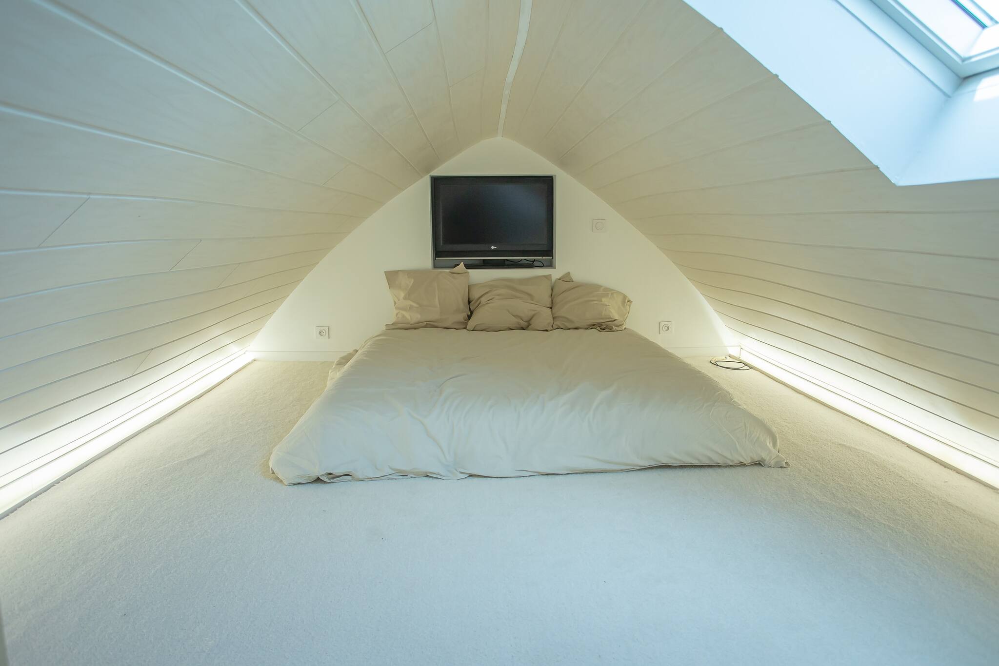 3ème étage: Terrasse / Cour intérieure avec spa et espace repas extérieur / 1 chambre lit King-Size / 1 dortoir ( comprenant : 2 lit simple 80cm , 1 lit double 140cm , 1 mezzanine avec lit 160cm + TV/console de jeux)