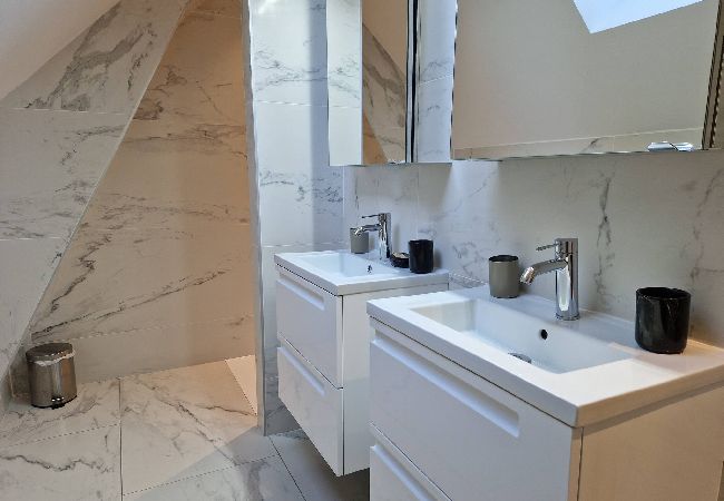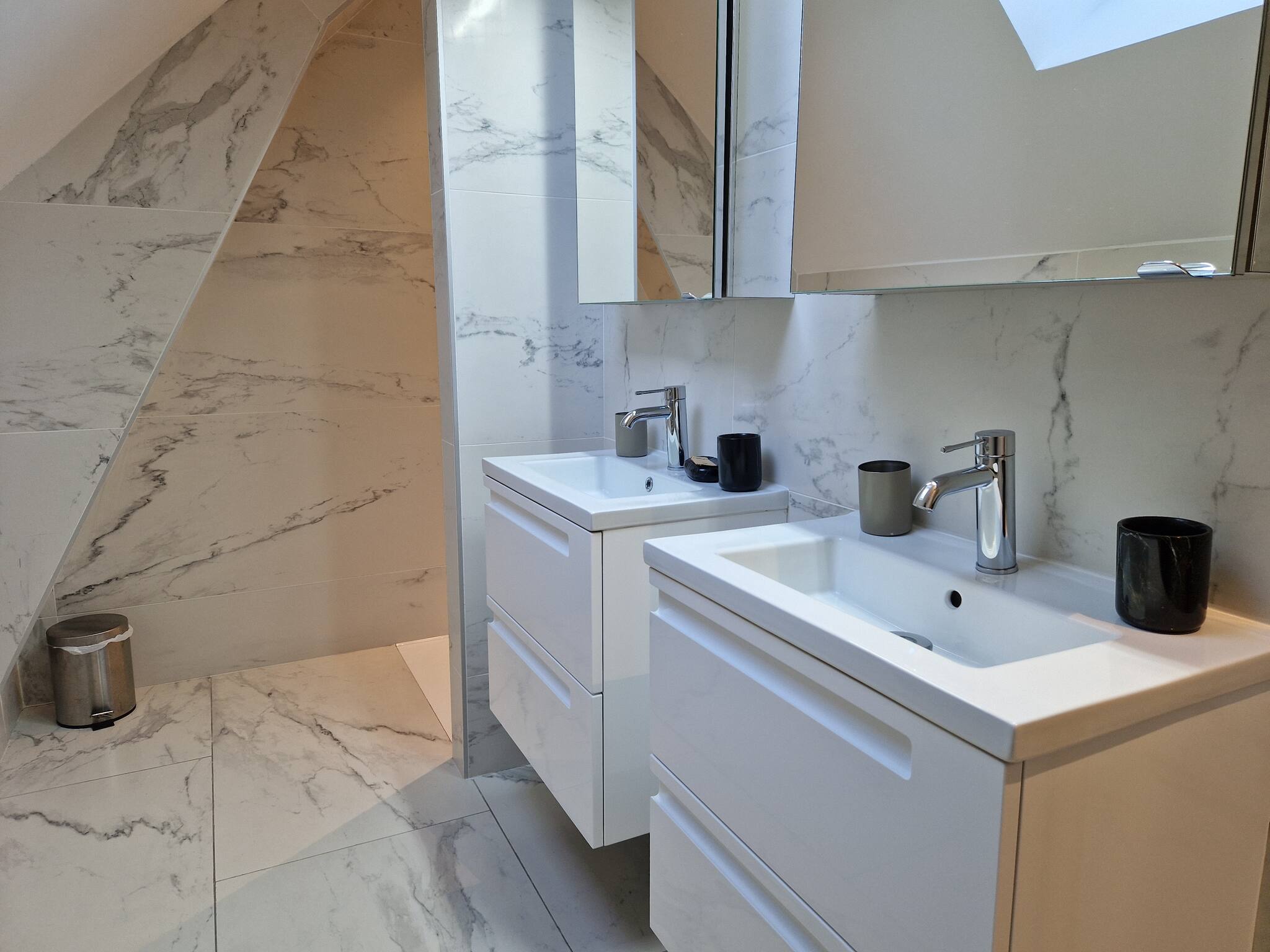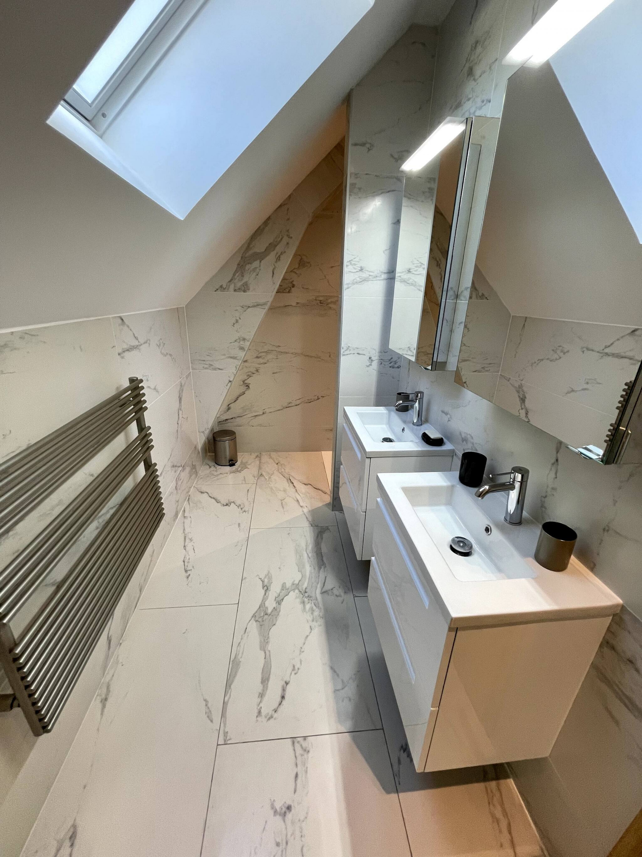 • Salle de bain moderne : douche à l'italienne et 2 vasques